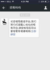 關(guān)注后會(huì)自動(dòng)彈出立即綁定的消息,點(diǎn)擊綁定賬號。
