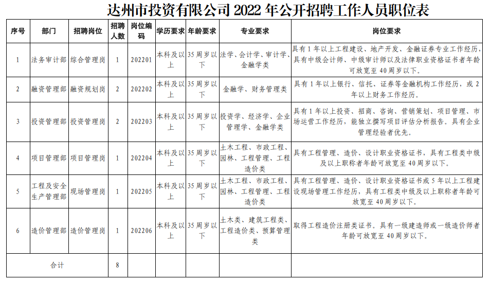 本次公開招聘設置崗位6個,擬招聘工作人員8人,其中:法務審計部1人、融資管理部2人、投資管理部2人、項目管理部1人、工程及安全生產(chǎn)管理部1人、造價管理部1人。